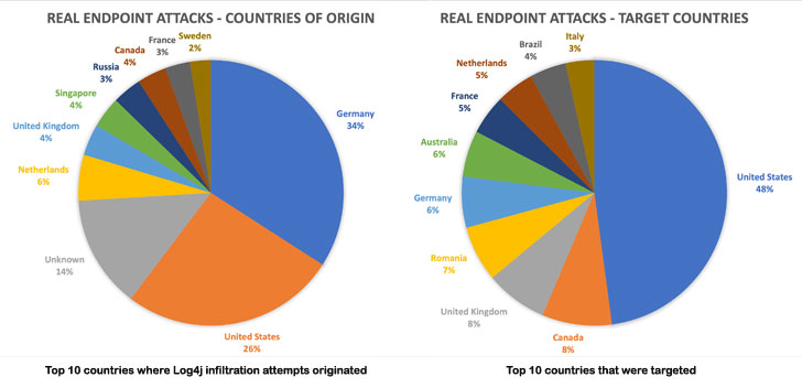 According to telemetry data collected between December 11 and December 15, Germany and the U.S. alone accounted for 60% of all the exploitation attempts. The most common attack targets during the observation period were the U.S., Canada, the U.K., Romania, Germany, Australia, France, the Netherlands, Brazil, and Italy.