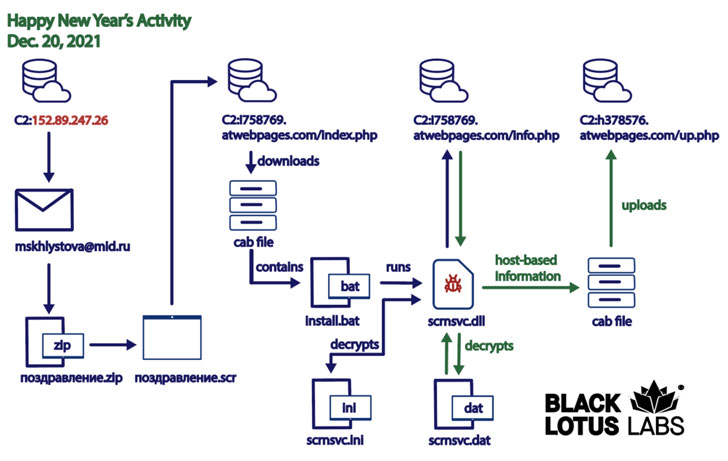 The third attack, also corroborated by Cluster25 earlier this week, began on December 20, 2021, using New Year's Eve festivities as a spear-phishing theme to trigger a multi-stage infection chain that culminated in the installation of a remote access trojan named Konni RAT.