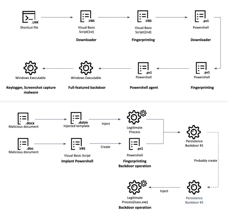 An alternative method used to trigger the infection chain is the use of Windows shortcut files (".LNK") to fetch the next-stage malware, a Visual Basic Script, that then acts a jump off point to execute a series of intermediary payloads, before installing a full-featured backdoor that comes with "enriched" capabilities to capture screenshots, record keystrokes, steal data from Chrome browser, and execute arbitrary commands.