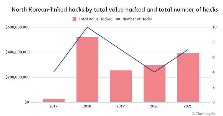If anything, these cyber offensives are paying off big time. According to a new report published by blockchain analytics firm Chainalysis, the Lazarus Group has been linked to seven attacks on cryptocurrency platforms that extracted almost $400 million worth of digital assets in 2021 alone, up from $300 million in 2020.