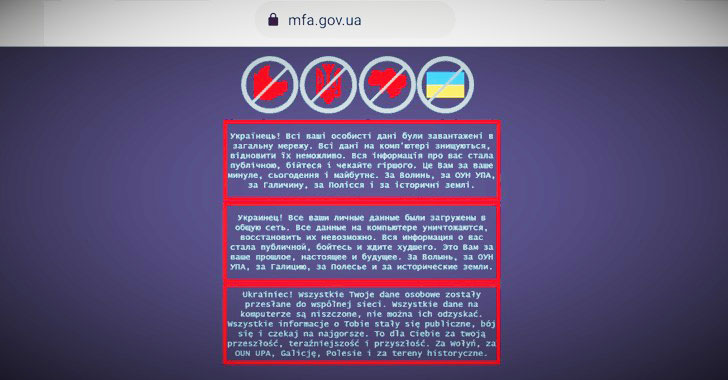 The development comes as numerous government websites in the Eastern European country were defaced on Friday with a message warning Ukrainians that their personal data was being uploaded to the Internet. The Security Service of Ukraine (SSU) said it found "signs" of involvement of hacking groups associated with the Russian intelligence services.