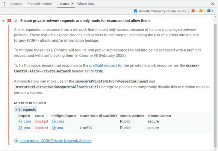 "The specification also extends the Cross-Origin Resource Sharing (CORS) protocol so that websites now have to explicitly request a grant from servers on private networks before being allowed to send arbitrary requests," Rigoudy noted in August 2021, when Google first announced plans to deprecate access to private network endpoints from non-secure websites.