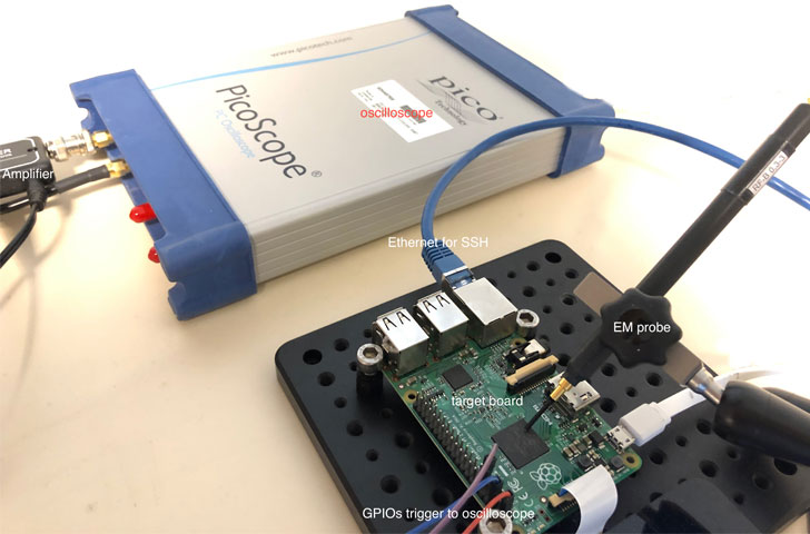 In an experimental setup, the researchers opted for a Raspberry Pi 2B as a target device with 900 MHz quad-core ARM Cortex A7 processor and 1 GB memory, with the electromagnetic signals acquired and amplified using a combination of an oscilloscope and a PA 303 BNC preamplifier, effectively predicting the three malware types and their associated families with an accuracy of 99.82% and 99.61%.