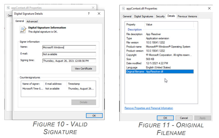 What stands out here is that appContast.dll is not only signed by Microsoft with a valid signature, but also that the file, originally an app resolver module ("AppResolver.dll"), has been tweaked and injected with a malicious script to load the final-stage malware.