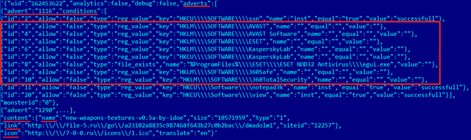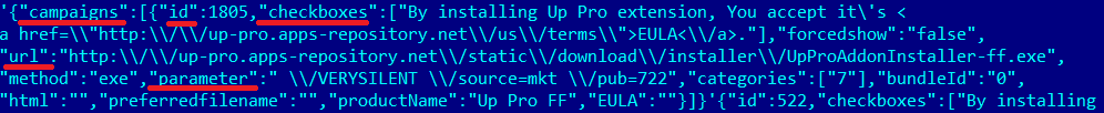 The server selects several id’s (usually 3-5) from the resulting adverts_done list and returns them to the campaigns list. For each id, this list has a checkboxes field containing the text to be displayed in the installation consent window, the url field containing a link to the installer of the given advert, and the parameter field containing a key for installing the unwanted software in silent mode.