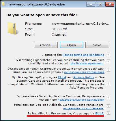After that, a window opens that simulates the download process in Internet Explorer. The loader does not explicitly notify the user that additional programs will be installed on the computer along with the downloaded file. Their installation can be declined only by clicking a barely discernible slider in the bottom part of the window.