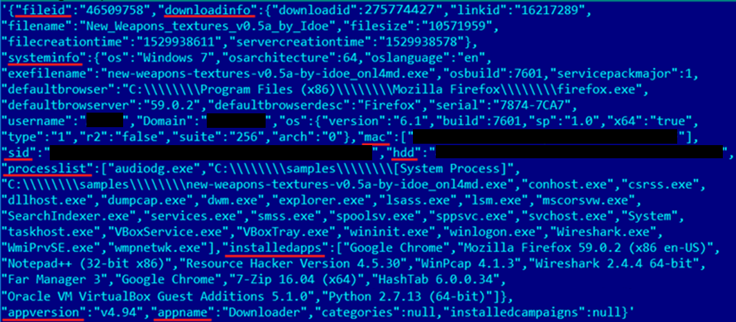 At stage one, the loader transmits information about the downloaded installer, plus data for identifying the victim to the server. The message includes confidential information: user name, PC domain name, MAC address, machine SID, hard drive serial number, lists of running processes and installed programs. Naturally, the data is collected and transmitted without the consent of the device owner.