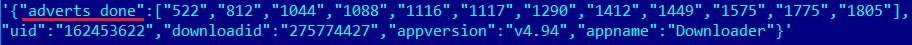 The installer checks that the conditions listed for each “advert” are fulfilled. If all conditions are met, the id of the advert is added to the adverts_done list. In the example above, for instance, the registry is checked for paths indicating that one of the selected antiviruses is installed on the computer. If this is the case, the partner software with id 1116 is not added to the adverts_done list and will not subsequently be installed on the user’s computer. The purpose of such a check is to prevent the installation of a program that would trigger antivirus software. Next, the generated list is sent to the server: