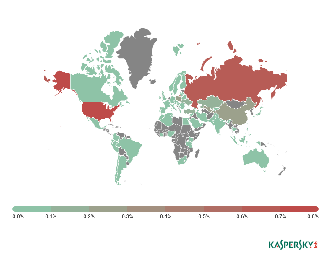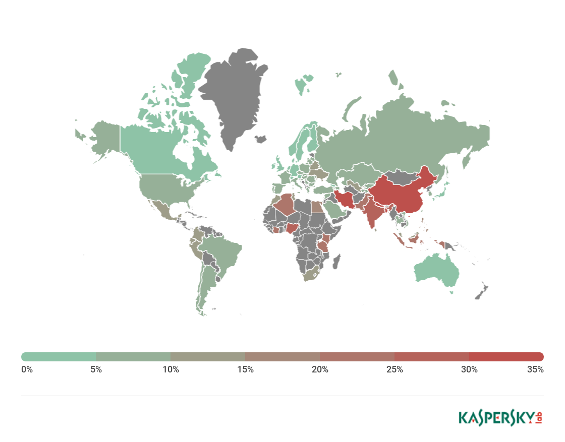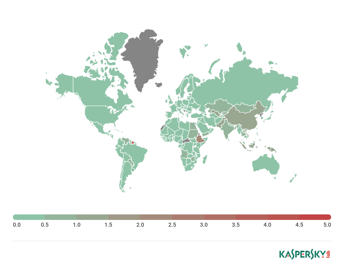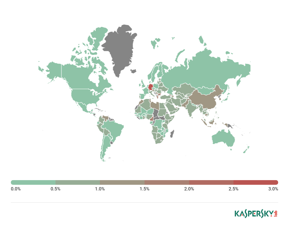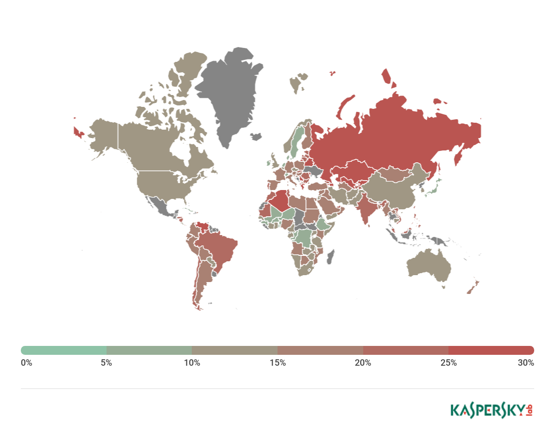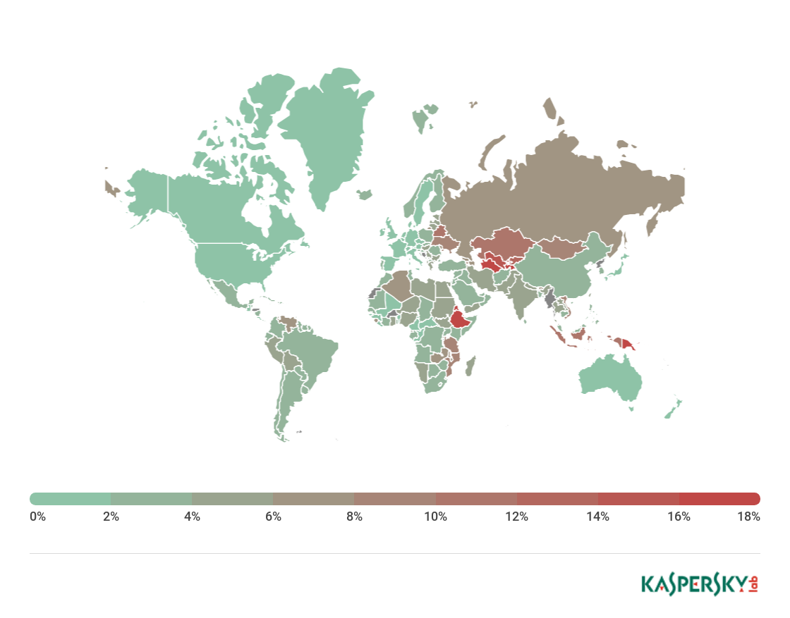 ** Unique users targeted by Malware-class attacks as a percentage of all unique users of Kaspersky Lab products in the country.