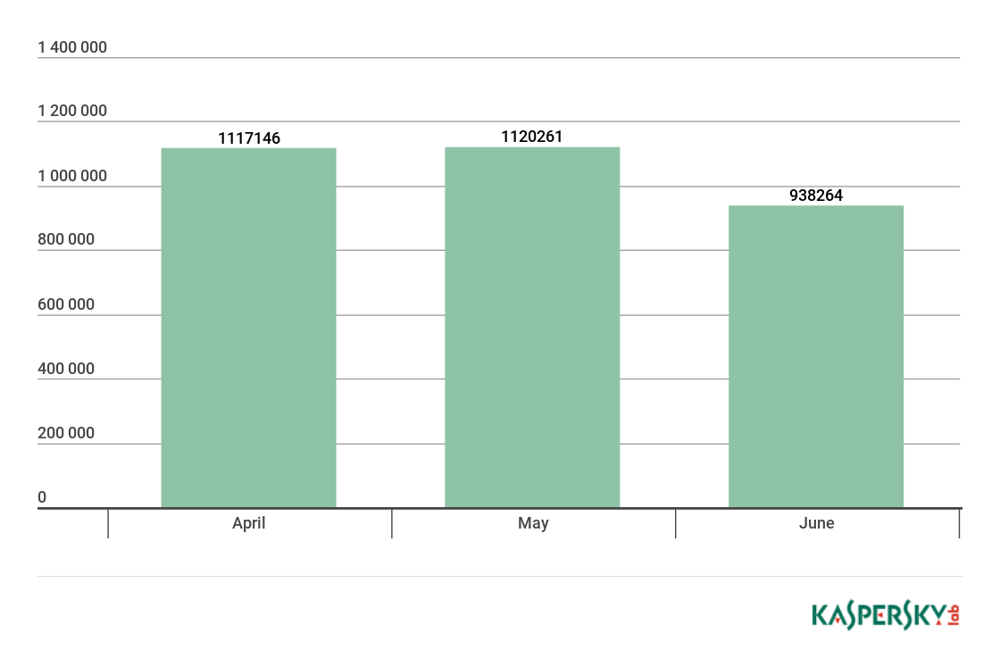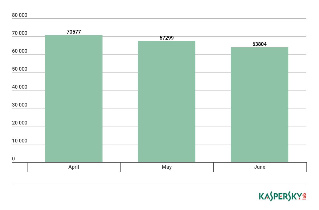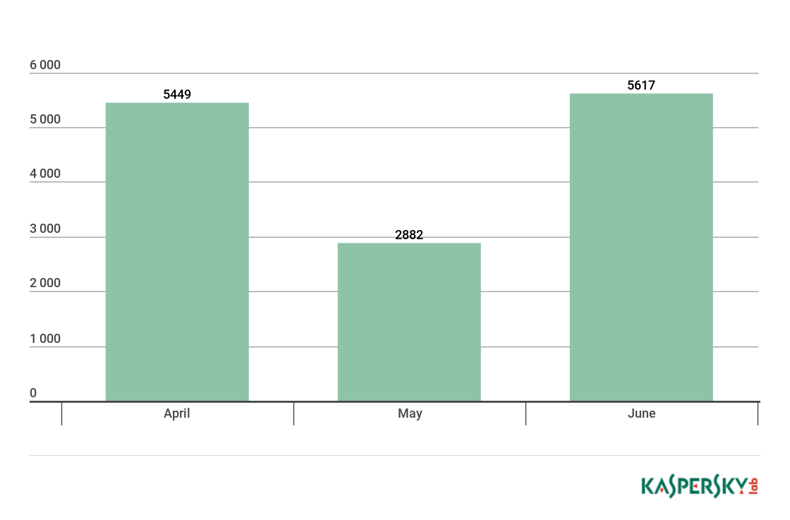 In April and May, the number of attacked users stayed roughly equal, and in June there was a modest decrease in cryptominers’ activity.