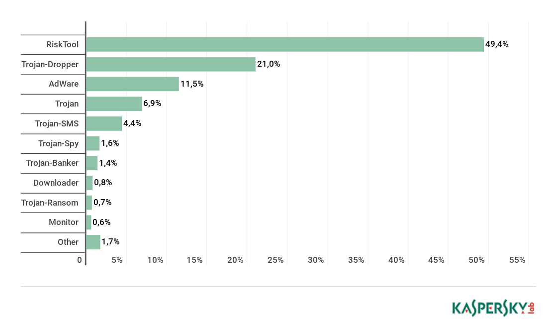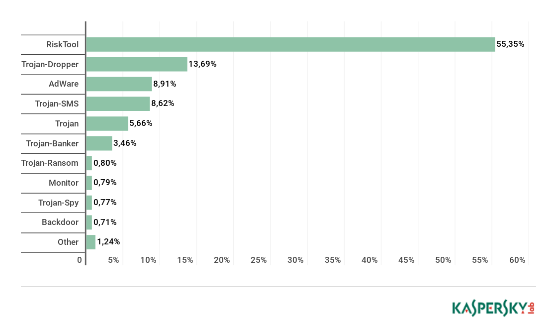 Second place was taken by Trojan-Dropper threats (13%), whose share fell by 7 p.p. Most detected files of this type came from the families Trojan-Dropper.AndroidOS.Piom and Trojan-Dropper.AndroidOS.Hqwar.