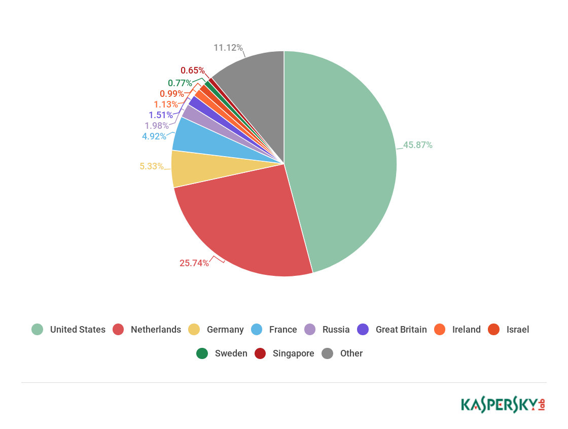 The following statistics are based on the physical location of the online resources used in attacks and blocked by our antivirus components (web pages containing redirects to exploits, sites containing exploits and other malware, botnet command centers, etc.). Any unique host could be the source of one or more web attacks. In order to determine the geographical source of web-based attacks, domain names are matched against their actual domain IP addresses, and then the geographical location of a specific IP address (GEOIP) is established.