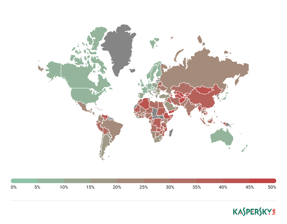 ** Unique users on whose computers Malware-class local threats were blocked, as a percentage of all unique users of Kaspersky Lab products in the country.