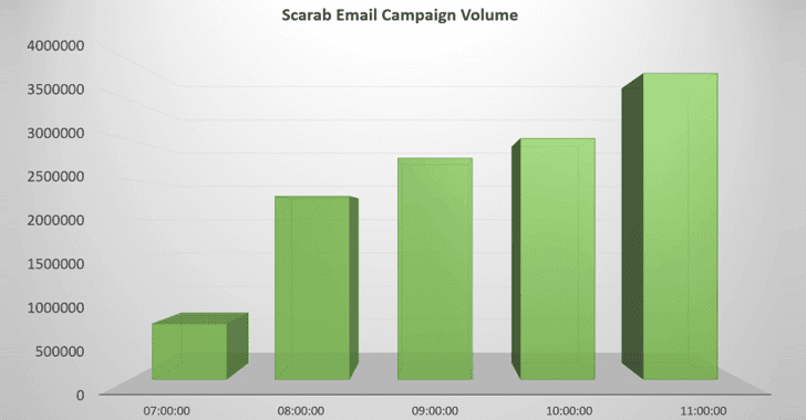 According to a blog post published by security firm Forcepoint, the massive email campaign spreading Scarab ransomware virus started at approximately 07:30 UTC on 23 November (Thursday) and sent about 12.5 million emails in just six hours.