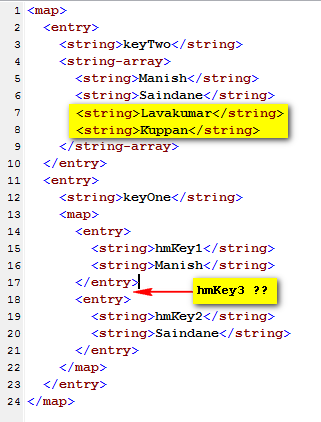 Notice how nicely XStream has rendered the XML from the given JAVA object. We can clearly see the <string-array> and the <map> elements (highlighted above) with the individual entries. We can edit the entries and modify it as we want. Let's modify the XML as follows: