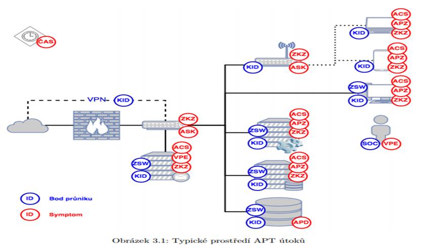 Na obrázku 3.1 je ilustrativně vyobrazeno typické prostředí organizace, ve kterém hrozí APT útok, s bezpečnostními aktivy, které se v daném prostředí vyskytují. Modrá kolečka identifikují body průniku, které jsou dále přiblíženy v tabulce 3.1, červená pak znázorňují výskyt symptomů, podle kterých lze rozpoznat APT útok. Přehled symptomů je pak uveden v tabulce 3.2. V následujícím odstavci je popsán obrázek z pohledu bezpečnostních aktiv na něm uvedených.