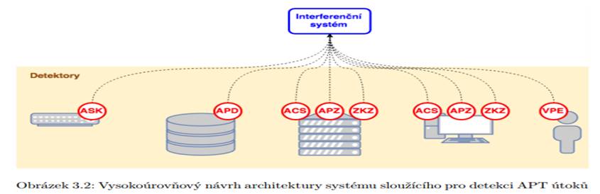 které jsou vzájemně provázány interferenčním systémem. Interferenční systém na zá- kladě informací z detektorů pomocí fuzzy logiky rozhoduje, zda došlo k APT útoku. Podle zadání diplomové práce je dále detailněji rozebrán a navržen detektor symptomu „abnormální síťová komunikace“, jako demonstrace tvorby jednotlivých detektorů.