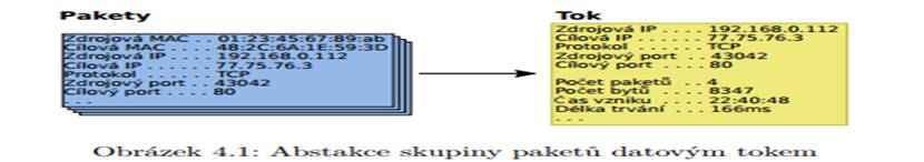Datové toky Nejčastější abstrakce nad datovým provozem jsou tzv. datové toky popsané v kapitole 4.1. V rámci toku jsou k dispozici statistické informace o reprezentovaných paketech, ale nejsou k dispozici data v nich obsažená. Tyto informace mohou poskytovat sondy pomocí IPFIX protokolu, který je určen právě pro přenos informací o tocích a specifikovaný organizací IETF. IPFIX vychází z NetFlow verze 9, což je proprietární řešení firmy Cisco, a sjednocuje přenos těchto informací ze zařízení různých výrobců. Vzhledem k tomu, že analýza chování nepotřebuje přístup k datům v paketech a pracuje se statistickými metodami, je mnohem vhodnější získávat informace o tocích. Pokud však chceme identifikovat zařízení podle MAC adres, nemůžeme použít standardní definici toků, jelikož ta zachycuje L3 vrstvu a vyšší. Až NetFlow verze 9 a z něj vycházející IPFIX umožňují pomocí šablon definovat obsah informací o toku a tím získat i MAC adresy účastníků.