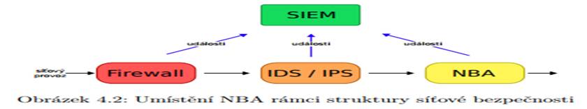 Behaviorální analýza se dnes používá jako doplňková služba k běžným způsobům založeným na ochraně perimetru pomocí firewallů a monitorování sítě pomocí IDS/IPS. Obvyklý způ- sob zapojení je zobrazen na obrázku 4.2, kde je síťový provoz nejprve filtrován firewallem, poté analyzován běžnými IDS/IPS a následně ještě analyzován pomocí NBA. Hlášení o potenciálních hrozbách je dále agregováno v SIEM systému.