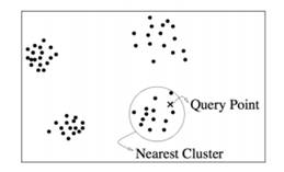 kde x a y jsou porovnávané vektory[32]. V těchto nalezených sousedech porovná algoritmus příslušnost do tříd a zařadí vzorek do té třídy, jejíž četnost je mezi sousedy nejvyšší. Při použití pro detekci anomálií zkoumá tento algorimus místo tříd sousedů pouze vzdálenost od jednotlivých sousedů, pokud je tato vzdálenost větší, než je obvyklé, je detekována anomálie. Na obrázku 4.5 je zobrazen model se shluky vzorků a testovaný vzorek, který je přiřazen do nejbližšího shluku.